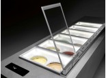 Cornice perimetrale dotata di illuminazione a LED comprensiva di guarnizione in PVC alimentare per la chiusura ermetica del vetro superiore, la guarnizione è sostituibile. Gelato/granite a vista grazie alla chiusura ermetica in vetro pirolitico, temperato e riscaldato. I vetri di chiusura ermetica sono disponibili per 2 o 4 fori con chiusura servoassistita. Porta gusti integrato nel profilo di apertura vetri lato cliente, etichette segna gusti incluse. Una volta aperto il vetro funge da barriera tra prodotto e cliente.