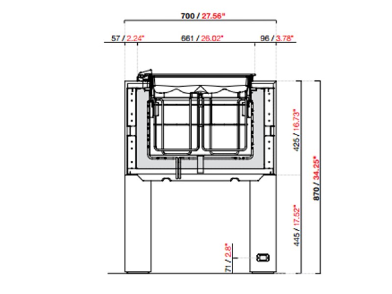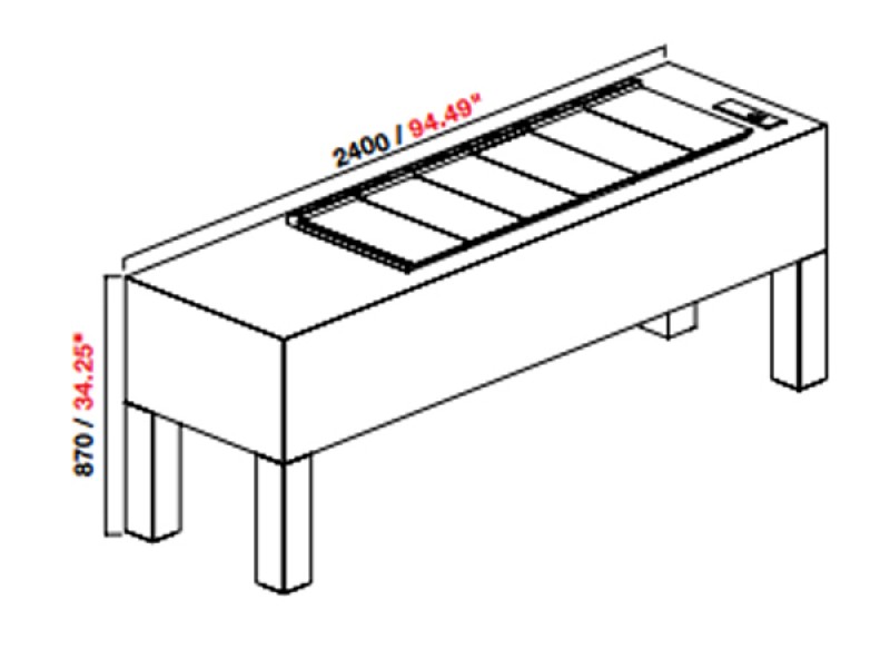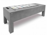 Struttura portante realizzata con tubolari e scatolati in lamiera zincata, rivestimento esterno in stratificato colore cemento. All’interno del tavolo BELLEVUE è alloggiata la vasca pozzetti PANORAMA da 12 fori senza riserva, realizzata con struttura schiumata con poliuretano a densità 40 Kg/mc (spessore 60 mm) completa di serpentina in tubo di rame affogata e valvola di espansione. Interno vasca in acciaio inox AISI 304 finitura 2B con piletta di scarico dotata di tappo di chiusura. Cestelli in filo plastificato per contenere le carapine, con integrato il sistema anti-rotazione, e vassoio superiore in policarbonato stampato a iniezione: vassoio e cestelli sono estraibili per consentire la pulizia della vasca. Il motore è alloggiato nell’apposito vano accanto alla vasca pozzetti PANORAMA ed è accessibile da sotto il tavolo grazie a un volano con fine corsa che consente la discesa del motore per le operazioni di pulizia e manutenzione. BELLEVUE è disponibile nella lunghezza L 2400 mm con 12 fori senza riserva, con 1 o 2 temperature differenziate (8+4 fori). Disponibile anche la versione con 4 ruote pivotanti di cui due dotate di freno. La presa elettrica per il collegamento è alloggiata in una gamba del tavolo.