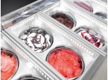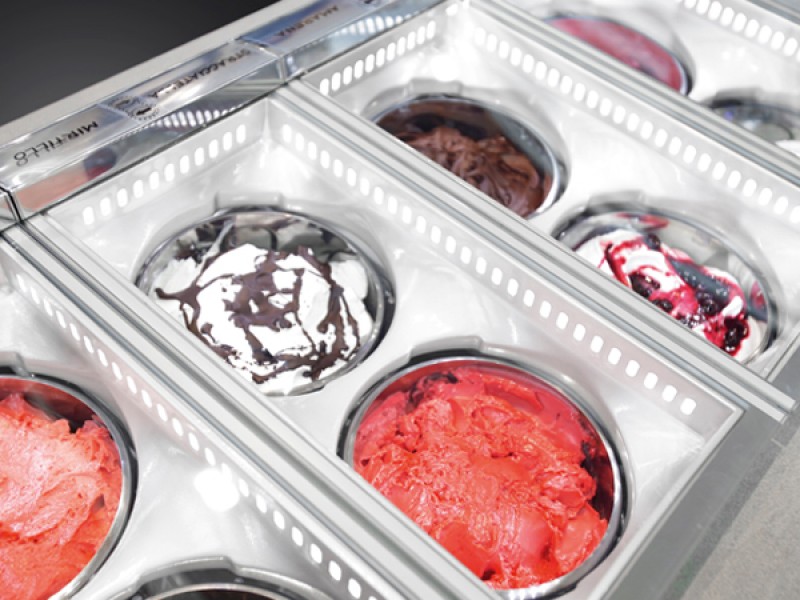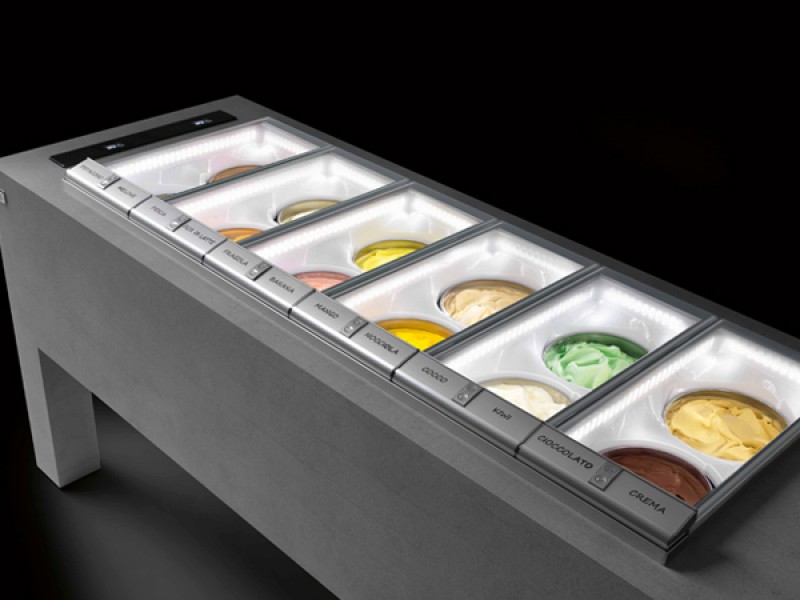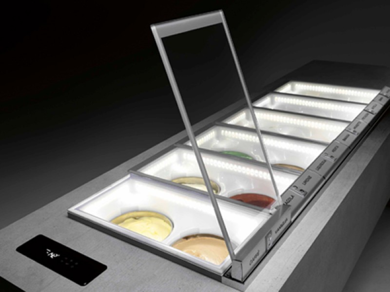Cornice perimetrale dotata di illuminazione a LED comprensiva di guarnizione in PVC alimentare per la chiusura ermetica del vetro superiore, la guarnizione è sostituibile. Gelato/granite a vista grazie alla chiusura ermetica in vetro pirolitico, temperato e riscaldato. I vetri di chiusura ermetica sono disponibili per 2 o 4 fori con chiusura servoassistita. Porta gusti integrato nel profilo di apertura vetri lato cliente, etichette segna gusti incluse. Una volta aperto il vetro funge da barriera tra prodotto e cliente.