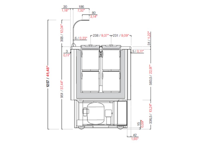 Vasca pozzetti con agitatore interno di aria per uniformare la temperatura e permettere la perfetta conservazione del gelato, con unità condensatrice