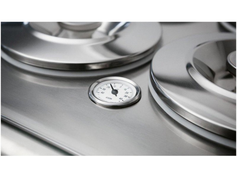 inox finitura Scotch-Brite con bordo anteriore e posteriore raggiato. Vetro di protezione curvo temperato, spessore 6 mm. Griglia di aerazione posteriore