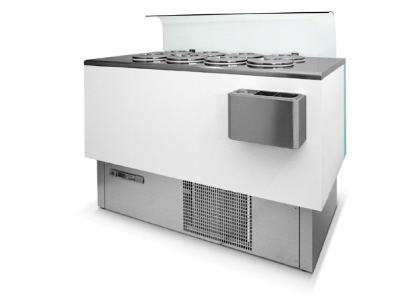 Vasca pozzetti con agitatore interno di aria per uniformare la temperatura e permettere la perfetta conservazione del gelato, con unità condensatrice