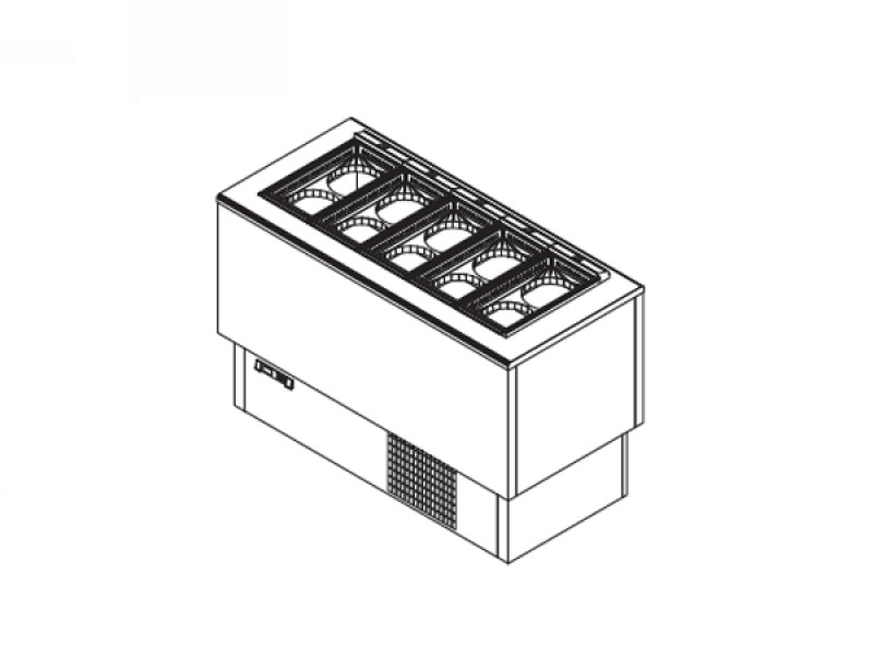 Vasca pozzetti con agitatore interno di aria per uniformare la temperatura e permettere la perfetta conservazione del gelato, con unità condensatrice a bordo (UC). Sbrinamento manuale con arresto dell’impianto: per raccogliere l’acqua di condensa disciolta nello sbrinamento occorre posizionare un contenitore per la raccolta dell’acqua al centro del lato sinistro del banco e togliere sia il tappo di chiusura dello scarico sia il tappo di fondo vasca all’interno del pozzetto. Pannello comandi elettronico con display digitale che permette di visionare la temperatura interna.