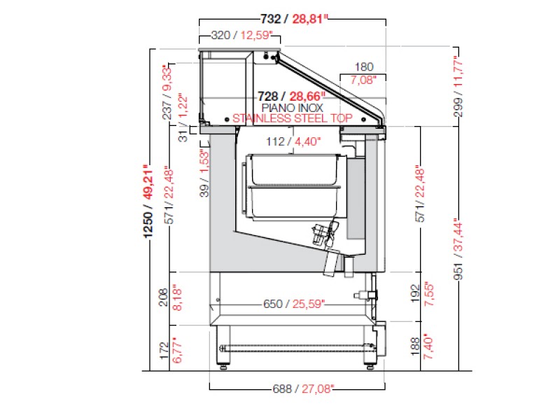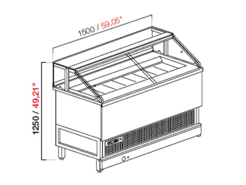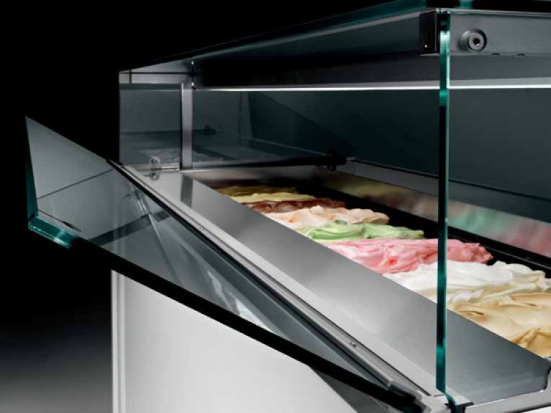 Struttura portante inferiore in tubolare d’acciaio verniciato con polveri epossidiche a forno a 180°C con elementi di irrigidimento e piedini regolabili. Scocca monoblocco con spessore minimo di 50 mm schiumata con poliuretano iniettato a bassa densità (40 Kg/mc). Nella vasca possono essere inserite vaschette gelato da 360x165 mm su fila singola con possibilità di alloggiare una seconda fila di riserva sotto quelle espositive (solo con vaschette alte 120 mm). Le vaschette gelato sono escluse dal prezzo. Su richiesta (optional) accessori vari per alloggiare torte gelato, coppe gelato, monoporzioni gelato e gelato su stecco. Sistema anticondensa con cavo caldo inserito all’interno di un tubo in alluminio affogato nella schiuma poliuretanica e posto a contatto del bordo perimetrale della vasca.