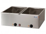 Bagnomaria 2 vasche GN 1/1 MOD. BM216 con struttura in acciaio inox, termostato di lavoro 0-90°C. Tutti i modelli sono dotati di piastra riscaldante che garantisce un miglior rendimento e non si brucia in caso di mancanza di acqua. Temperature differenziate nei modelli doppi.