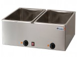 Bagnomaria 2 vasche GN 1/1 MOD. BM221 con struttura in acciaio inox, termostato di lavoro 0-90°C. Tutti i modelli sono dotati di piastra riscaldante che garantisce un miglior rendimento e non si brucia in caso di mancanza di acqua. Temperature differenziate nei modelli doppi.