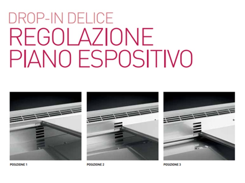 Il piano espositivo dei banchi DROP-IN DELICE con servizio freddo ventilato è costituito da piani amovibili in acciaio inox finitura Scotch Brite incassati di 30 mm rispetto al bordo perimetrale e ulteriormente ribassabili di altre 2 postazioni di 20 mm ciascuna, per consentire di esporre e conservare adeguatamente merce di altezza diversa.