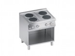 Cucina quattro piastre tonde elettrica con vano a giorno modello K7ECU10VV, struttura in acciaio inossidabile. Manopole in materiale plastico termoindurente. Riscaldamento ottenuto tramite piastre elettriche rotonde in ghisa.