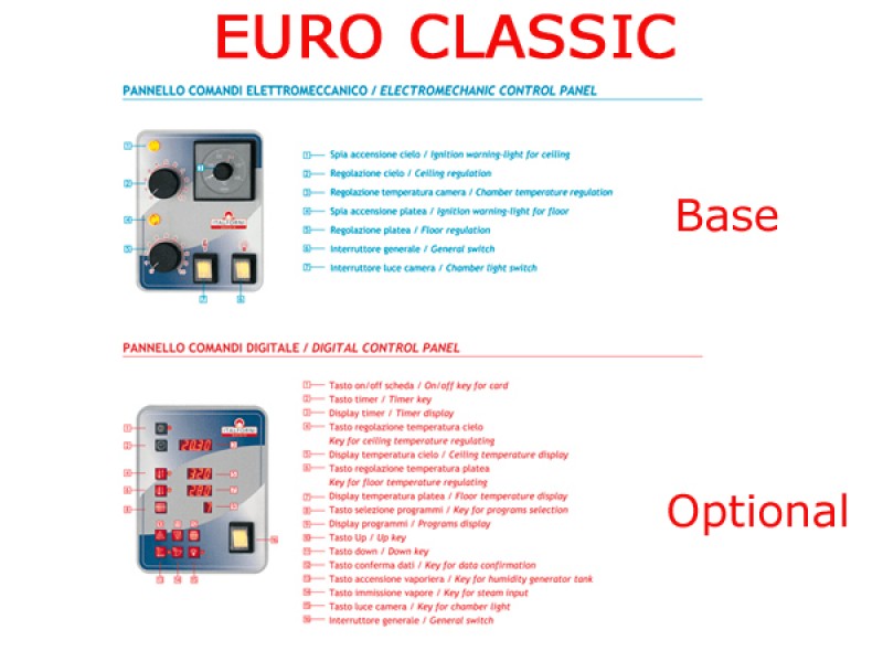 Elementi riscaldanti elettrici inseriti nel refrettario del cielo e del piano. Sportello controllobilanciato a battente incernierato in basso. Illuminazione interna protetta. Camere indipendenti con regolazione elettronica separata cielo/piano.