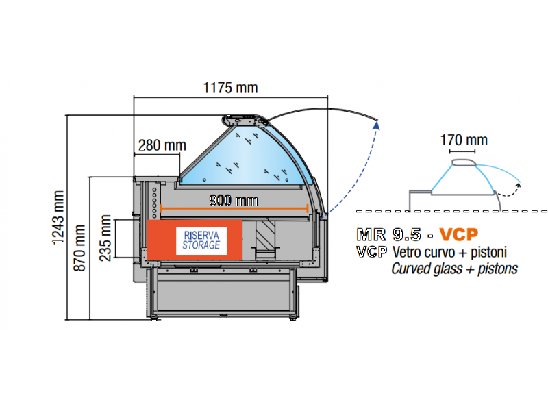 - Spalle termoformate e coibentate (spessore 40 mm);- Fianchi laterali in vetro temperato predisposti per mensola intermedia;- Pannello comandi elettronico; - Riserva refrigerata a sportelli;- Plafoniera con illuminazione led;- Piano di lavoro in acciaio inox; - Piano espositivo in acciaio inox;- Vaschetta evapora-condensa automatica con galleggiante (CG);- Sbrinamento a fermata; - Vetro deflettore (solo per versione refrigerata)