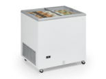 conservatore orizzontale a vetri scorrevoli, ideale per prodotti da pasticceria gelateria e alimenti surgelati. Dotato di evaporatore statico avvolto sulla fascia, modelli con coperchi vetrati scorrevoli, 4 ruote pivotanti e serratura.