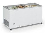 conservatore orizzontale a vetri scorrevoli, ideale per prodotti da pasticceria gelateria e alimenti surgelati. Dotato di evaporatore statico avvolto sulla fascia, modelli con coperchi vetrati scorrevoli, 4 ruote pivotanti e serratura.