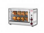 Girarrosto elettrico con movimento ad aste singole sovrapposte mod. E-8P-S2 (8 polli - n° 2 aste, luce 72 cm) realizzate in acciaio Inox con porte a vetro e comandi elettromeccanici.