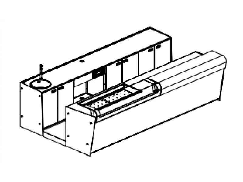 Retro Banco composto da 1 lavello diametro 42 cm, zona da 100 cm 2 sportelli neutri a sx, zona a giorno da 100 cm (per lavabicchieri o produttore di ghiaccio), zona da 200 cm a 4 sportelli neutri a dx.