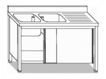 Lavello in acciaio inox AISI 441 con top lavatoio in acciaio inox AISI 304 mod. 410562.14 di misure L140xP60xH85 cm, armadiato con ante scorrevoli, ripiano di fondo, alzatina a muro, e 2 vasche da 40x40xH25 cm e gocciolatoio a destra. Dotato di tappo troppo pieno. Non è compreso nel prezzo il sifone e il miscelatore.