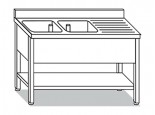 Lavello su 4 gambe con ripiano di fondo, realizzato in acciaio inox AISI 441 con top lavatoio in acciaio inox AISI 304 mod. LRD.19 di misure L190xP70xH85 cm, con alzatina a muro, e 2 vasche da 60x50xH30 cm e con gocciolatoio. Dotato di tappo troppo pieno. Non è compreso nel prezzo il sifone e il miscelatore.