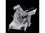 Affettatrice a gravità mod. F 300 E con affilatoio fisso, CE professionale, Costruzione secondo gli standard 89/336 CE e 89/109 CE in alluminio anodizzato, con lama di acciaio temprato e cromato. Rispondente alle più rigorose esigenze igieniche.