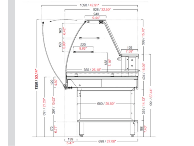 Lo speciale tubolare passacavi in alluminio posizionato a sinistra (lato operatore) della vetrina è unico per i cavi dell'eventuale mensola calda e per la plafoneria. MIX, sono disponibili con plafoneria di illuminazione a LED.