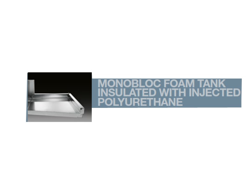 Scocca monoblocco con spessore minimo di 50 mm schiumata con poliuretano iniettato a bassa densità (40 Kg/m3).