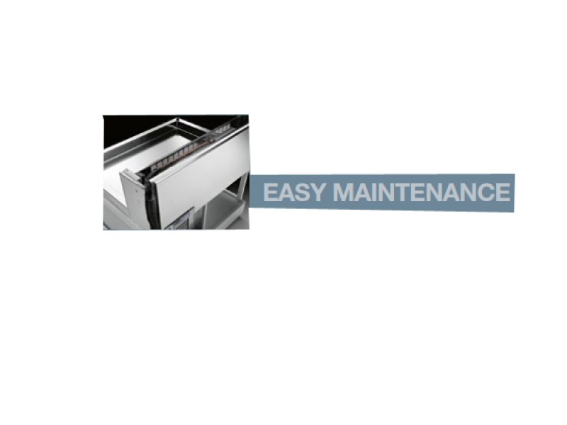 I tubi evaporatore e i cavi di collegamento motore sono posizionati nella parete lato operatore e sotto il piano lavoro per la facile ispezione e/o manutenzione in loco, anche nel caso in cui la vetrina sia in composizione di arredo. Il condensatore è posizionato sul lato operatore ed è accessibile smontando la griglia di protezione, per le normali operazioni di pulizia.