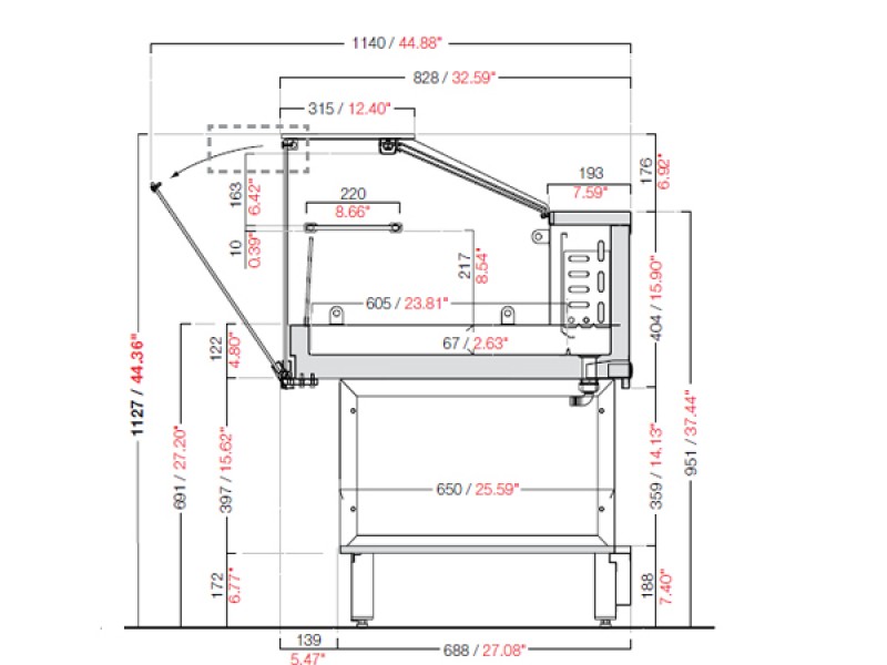Il piano espositivo coincide con il fondo della vasca in acciaio inox ed è quindi incassato di 67 mm rispetto al bordo perimetrale della vasca.
