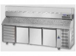 Banco pizza refrigerato 60X40 con 3 sportelli + cassettiera non refrigerata a 6 cassetti 60x40 cm e motore a bordo, con vetrina refrigerata (bacinelle e coperchi non inclusi)