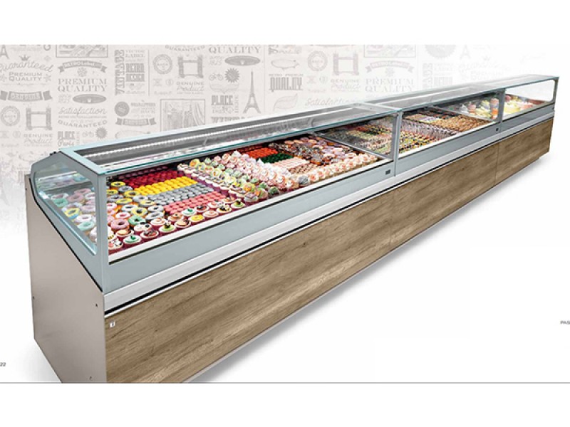 Vetrina Pasticceria ventilata mod. SAM80 DA 212,5  versione monofase 50 hz, con chiusura posteriore in plexiglass.