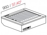 Drop in da incasso senza vetri, freddo ventilato/ caldo secco modello L950 senza pannellatura, struttura portante inferiore in tubolare d'acciaio verniciata con polveri epossidiche a forno 180°C con elementi di irrigidimento, piedini regolabili. Scocca monoblocco schiumata con poliuretano a bassa densità con spessore minimo di 50 mm. Parti a vista in acciaio inox AISI 304 finitura Scotch Brite. Sistema anti condensa con cavo caldo inserito all'interno di un tubo in rame posto a contatto della cornice perimetrale della vasca. Il piano espositivo dei banchi DROP-IN DELICE con servizio freddo/caldo è costituito da un unico piano in vetro bianco temperato con serigrafia resistiva incassato di 30 mm rispetto al bordo perimetrale e ulteriormente ribassabili di altre 2 postazioni di 20 mm ciascuna, per consentire di esporre e conservare adeguatamente merce di altezza diversa. La regolazione del piano espositivo in vetro è facilitato dalle maniglie laterali.