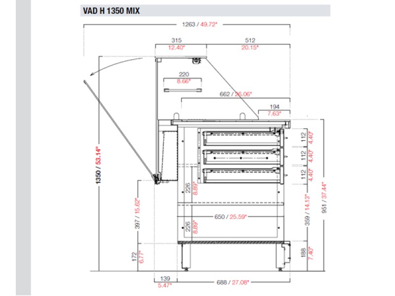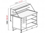 Vetrina mix pizza neutra vetro alto dritto mod. VAD . Basamento in tubulare d'acciaio verniciato con polveri apossidiche a forno 180°C con elementi di irrigidimento e piedini regolabili. Piano in acciaio inox con bugne e invaso porta teglie. Ripiani interni in lamiera grigio, dotazione di tre cassetti da 1/6, il primo con serratura.