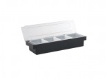 Porta condimenti a 4 comparti Mod. PCO4. Struttura in plastica completa di coperchio in plastica, contiene bacinelle portacondimenti di 2 diverse misure intercambiabili. Colore nero.