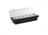 Porta condimenti a 6 comparti Mod. PCO6. Struttura in plastica completa di coperchio in plastica, contiene bacinelle portacondimenti di 2 diverse misure intercambiabili. Colore nero.