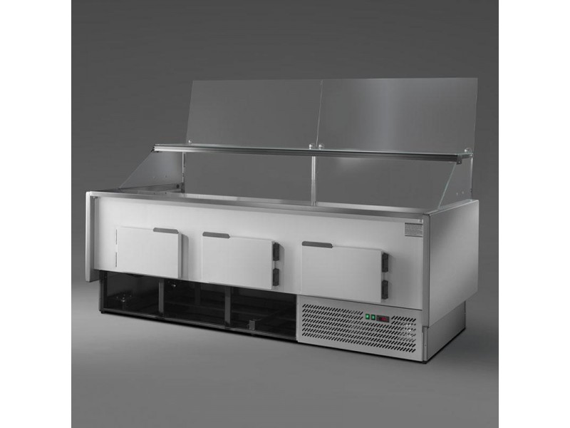 - Spalle termoformate e coibentate (spessore 40 mm);- Fianchi laterali in vetro temperato predisposti per mensola intermedia;- Pannello comandi elettronico; - Riserva refrigerata a sportelli;- Plafoniera con illuminazione led;- Piano di lavoro in acciaio inox; - Piano espositivo in acciaio inox;