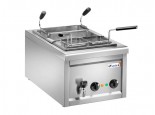 Cuocipasta elettrico da banco mod. CC11 con struttura realizzata in acciaio inox AISI 304, vasca cestelli, piano appoggio cestelli e griglia di fondo in AISI 316. Termostato 0-110. Interrutore 0-l. Rubinetto di scarico.