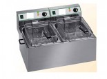 Friggitrice elettrica da banco mod FR88N con 2 vasche e coperchio in acciaio inox. Cestelli a rete estraibili in filo cromato, manici cestelli e pomelli coperchi in plastica termoisolante, resistenze inox.